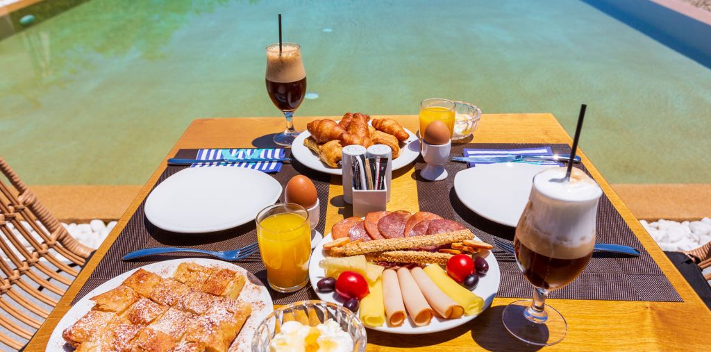 Local produce like yogurt, honey and delicious seasonal fruits, along with a selection of delectable cold cuts and cheeses, bread, jams, cereal (with an alternative choice for gluten-free products), cakes, mouthwatering traditional desserts and home-made pies, are served with fresh coffee, juice or tea, to power up your day!