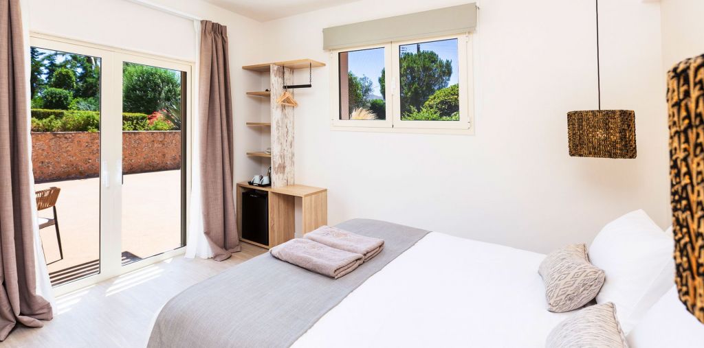 Welcoming you to their relaxing ambiance, our Deluxe Double Rooms offer you a cozy king size bed, laid out with hypoallergenic, anatomic mattress and topper, a modern bathroom with a rain shower, and a spacious, furnished veranda that looks out on the verdant gardens.